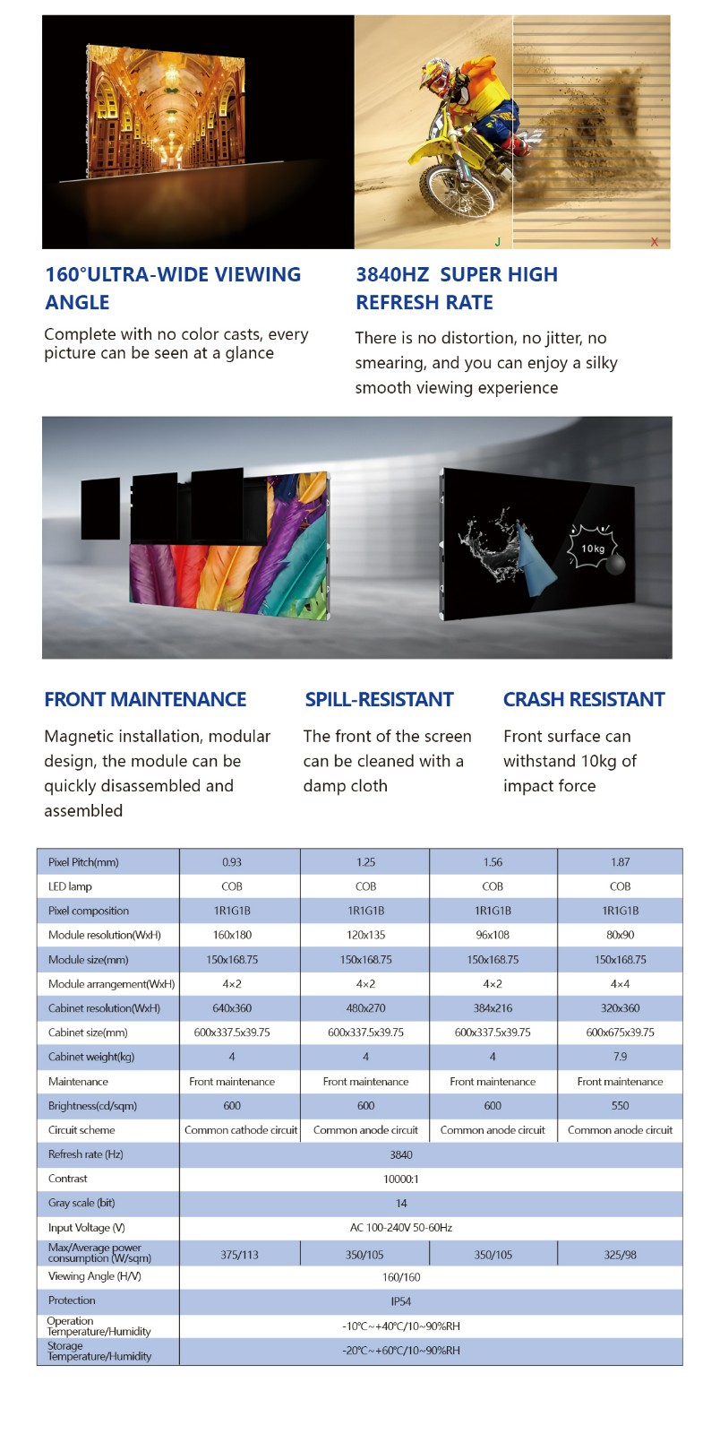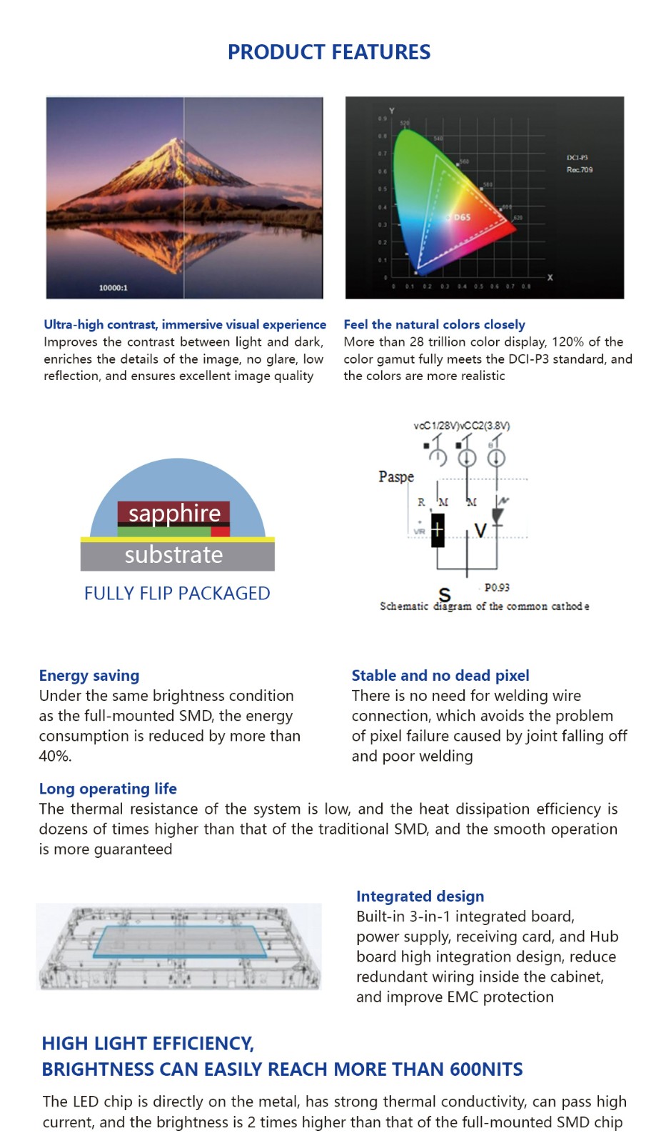 Pixel to Perfection: From 0.9mm pixel pitch, True 16:9 Ratio: With 600×337.5mm cabinet size, High Contrast & Brightness: Achieves 10,000:1contrast ratio Wide Viewing Angle: 160°/160° viewing angle Full Front Maintenance: f ront-access design. Power-Eff icient Design: Up to 40% lower energy consumption compared to SMD-based solutions. Die-Cast Aluminum Cabinet: Lightweight and robust, offering excellent thermal dissipation and sleek aesthetics.