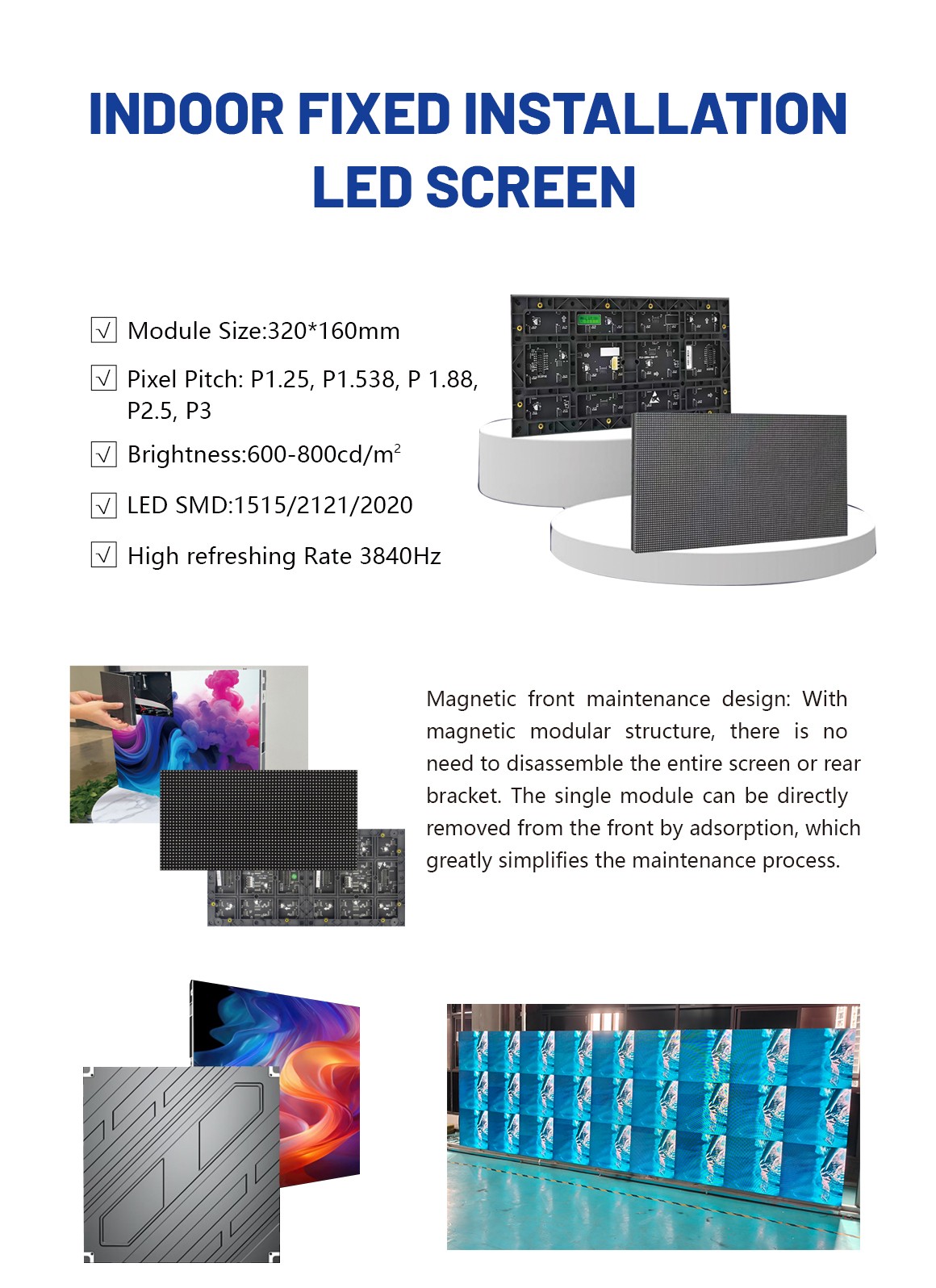 Fine Pixel Pitch Range: 1.25mm to 3.0mm for full indoor clarity High Ref resh Rate: Up to 3840Hz for flicker- free video playback Flexible Installations: Wall-mounted or floor- supported High Contrast Ratio: 5000:1ensures deep blacks and vivid colors